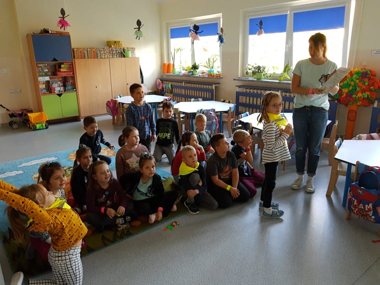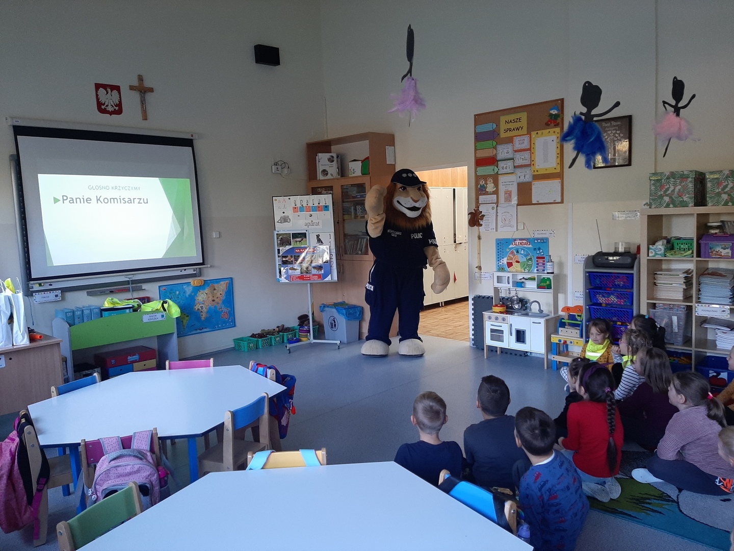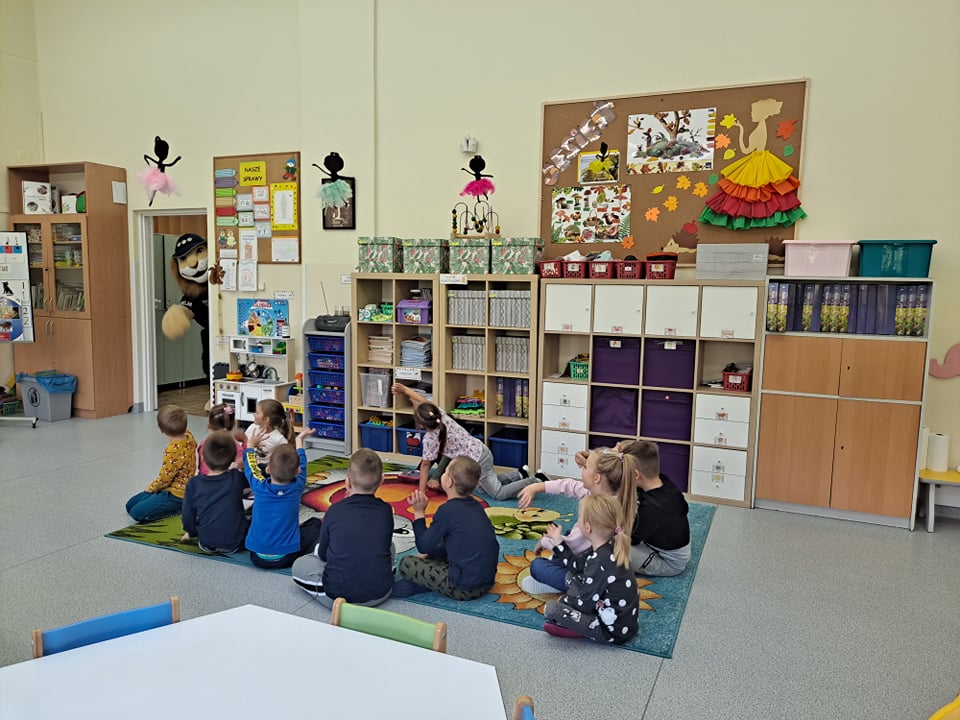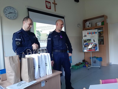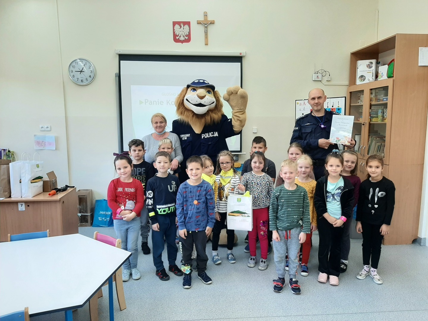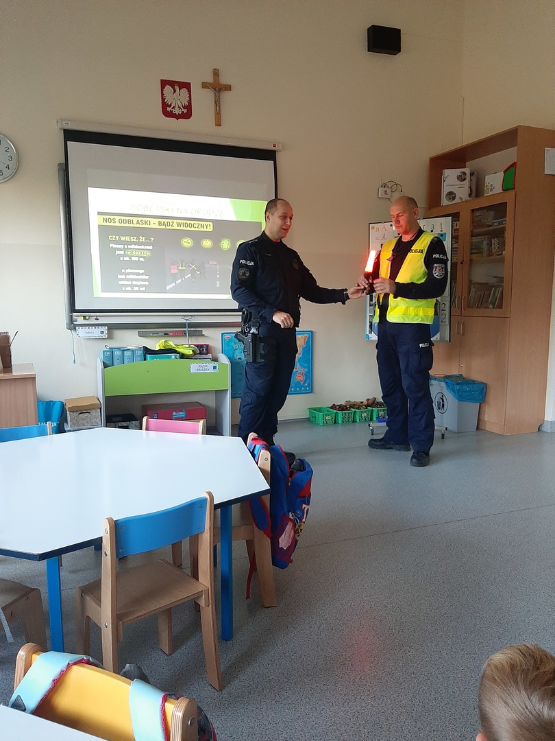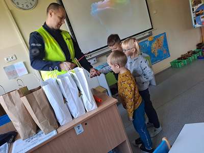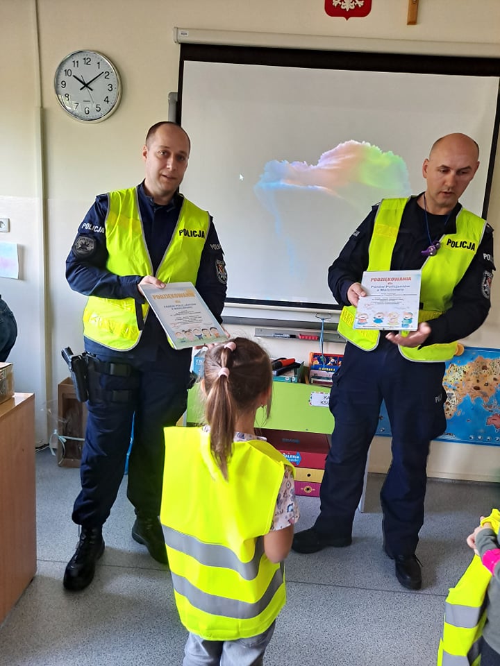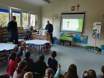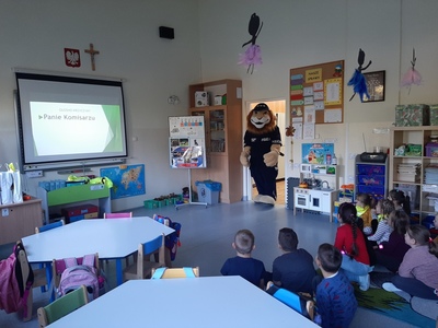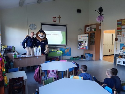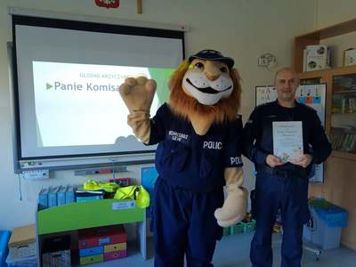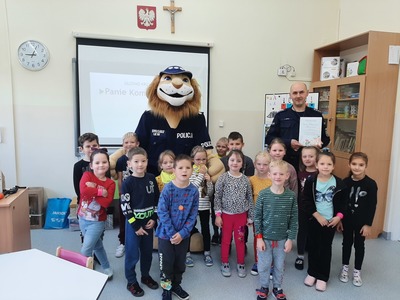 15 października najmłodsi uczniowie naszej szkoły - grupa Truskawek, oddział 0a i 0b wzięli udział w zajęciach nt. bezpiecznego poruszania się po drodze. Policjanci pan asp. szt. Piotr Król Piotr Król i pan mł. asp. Łukasz Piech przygotowali dla dzieci prezentację oraz konkurs wiedzy. Największą jednak radość sprawiła dzieciom wizyta z KOMISARZEM LWEM. Policjanci rozmawiali z najmłodszymi, o bezpiecznym poruszaniu się po drogach, a w szczególności omówili zasady bezpiecznej drogi do i ze szkoły. Przypomnieli również o korzyściach noszenia elementów odblaskowych przy ubraniu bądź tornistrze oraz jak należy zachować się, gdy zaczepi nas obca osoba. Za aktywność wszystkie dzieci zostały obdarowane różnymi odblaskami oraz słodkościami. Serdeczne podziękowania składamy również dla sponsorów: