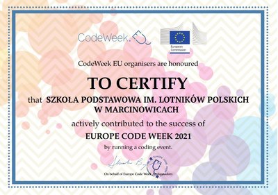 CERTYFIKAT Nasza szkoła otrzymała certyfikat uczestnictwa w #CodeWeek 2021 Zdjęcia Zobacz również WYCIECZKA DO WAŁBRZYCHA ZMIANA NUMERU TELEFONU UWAGA KONKURS! CERTYFIKAT MAMY FINALISTKĘ KOLEJNA FINALISTKA 02 listopada 2021 Aktualności Wydrukuj Udostępnij Wyświetlono: 219