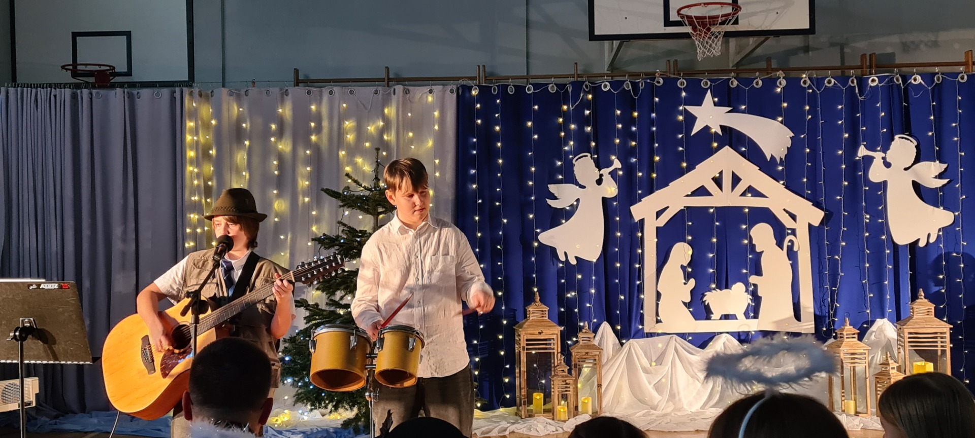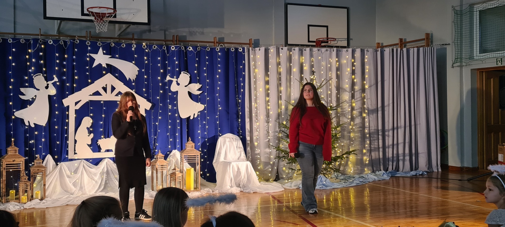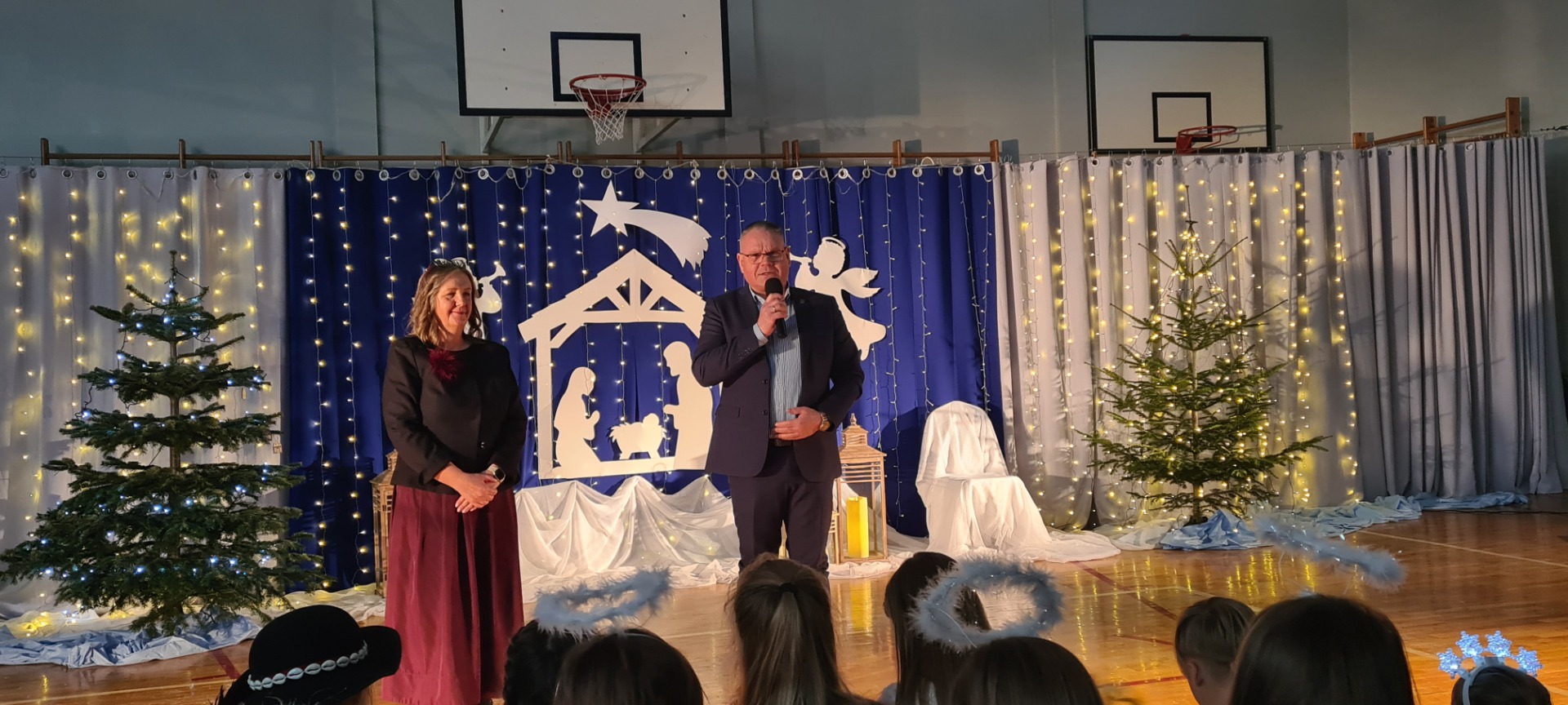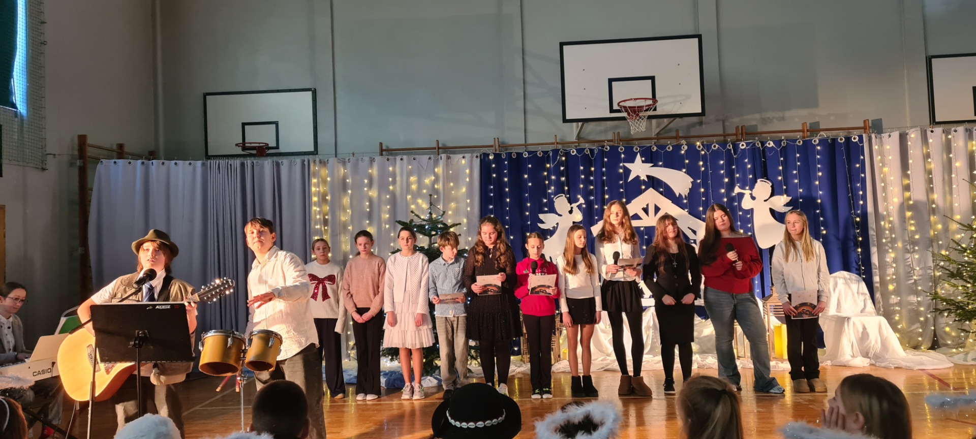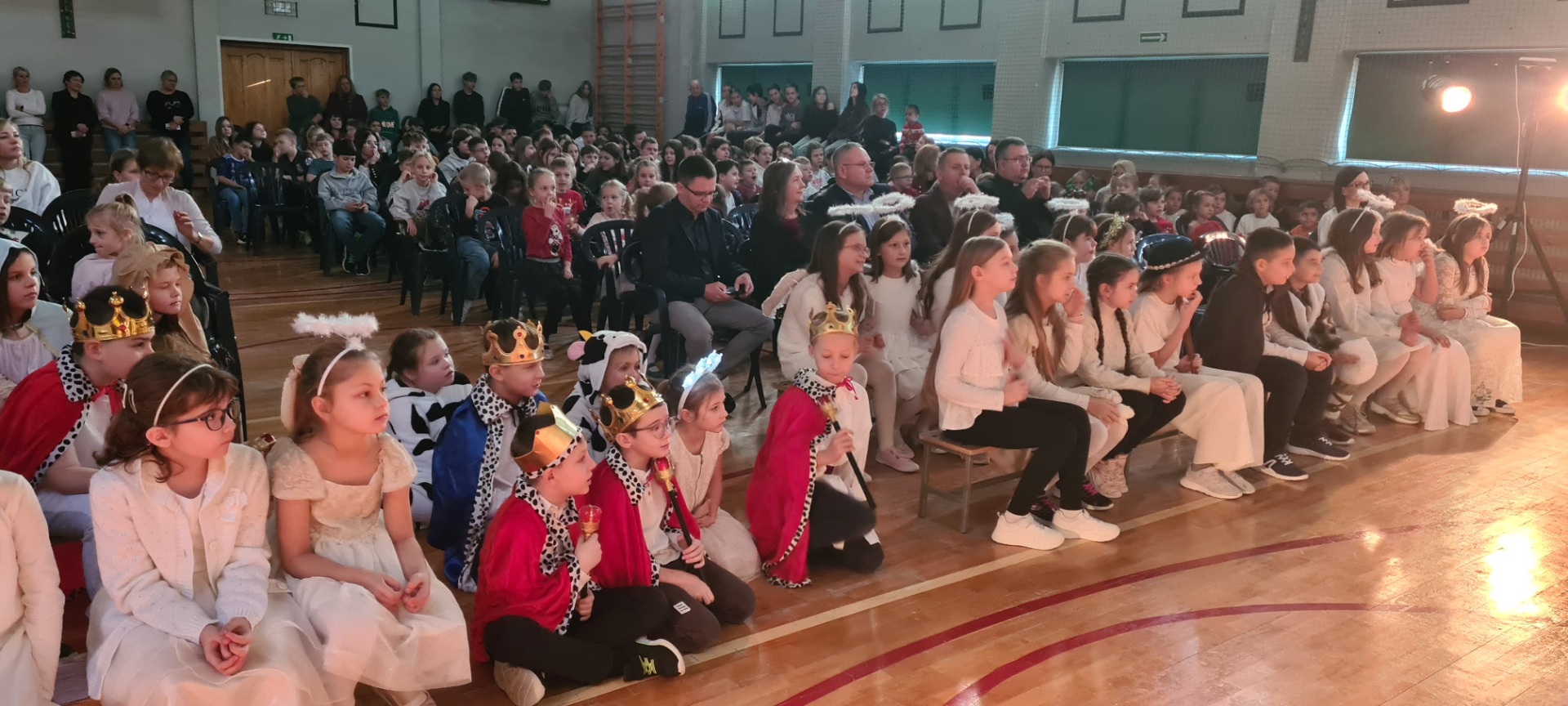 Nasza sala gimnastyczna zamieniła się w prawdziwą betlejemską scenę — wszystko za sprawą wyjątkowych jasełek przygotowanych przez naszych uczniów. Dzieci z ogromnym zaangażowaniem i sercem odegrały swoje role, a ich piękne występy oraz wzruszający śpiew kolęd poruszyły wszystkich obecnych. Mali aniołowie, pasterze i królowie zachwycili nie tylko kostiumami, ale przede wszystkim autentycznością i szczerym entuzjazmem, z jakim występowali.