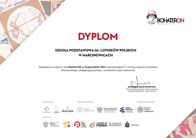 15 lutego 2022 Aktualności PODZIĘKOWANIE Nasza szkoła otrzymala podziękowanie od organizatorów za udział w projekcie BohaterON w Twojej Szkole, którego celem było uhonorowanie i upamiętnienie uczestników Powstania Warszawskiego oraz... Czytaj więcej