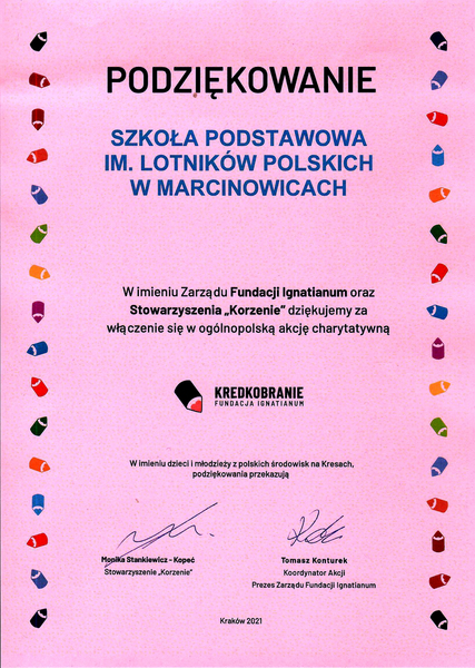 20 lutego 2022 Aktualności PODZIĘKOWANIE ZA KREDKOBRANIE 2021 Przez cały wrzesień 2021 roku trwała w naszej szkole akcja charytatywna „Kredkobranie”. Uczniowie i Rodzice po raz kolejny pokazali wielkie zaangażowanie, wrażliwość i hojność. Dzięki wielkim... Czytaj więcej