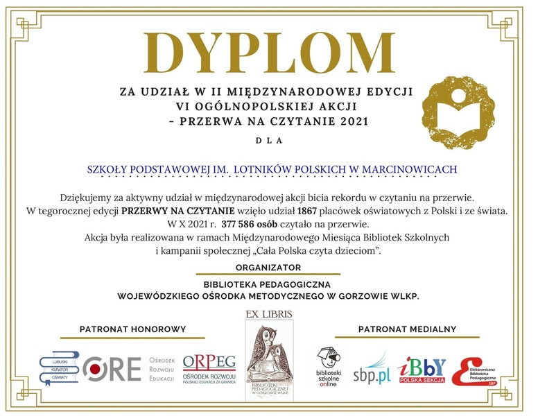 04 stycznia 2022 Aktualności PODSUMOWANIE I PODZIĘKOWANIE Miło nam poinformować o otrzymaniu podziękowania za aktywny udział w międzynarodowej akcji bicia rekordu czytania na przerwie. To kolejna inicjatywa promująca czytanie w naszej szkole. Jeszcze raz dziękujemy... Czytaj więcej