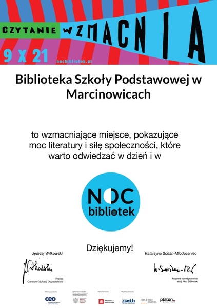 04 stycznia 2022 Aktualności CZYTANIE WZMACNIA! Takie podziękowanie otrzymaliśmy od organizatorów akcji Noc Bibliotek, czyli Centrum Edukacji Obywatelskiej za zorganizowanie w akcji w naszej bibliotece. Czytaj więcej